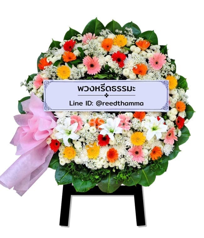 พวงหรีด โทนสีผสมสดใส ตกแต่งด้วยดอกไม้ดังต่อไปนี้