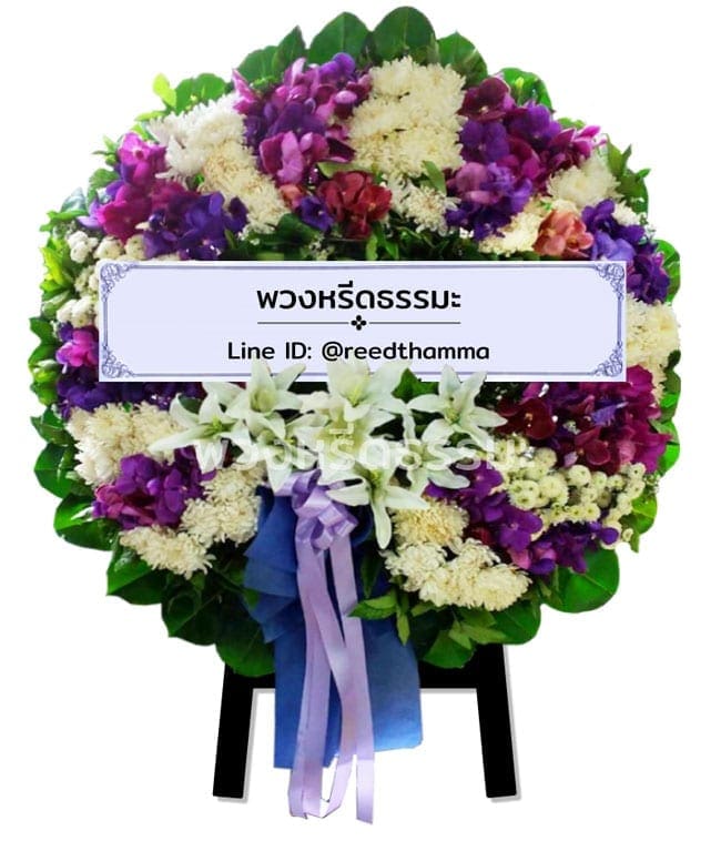 พวงหรีดหรู ส่งพวงหรีดสีขาวม่วง สลับสี พวงหรีดสวย SP08 ขนาดประมาณ 130 ซม. อาจตกแต่งพวงหรีดด้วย: