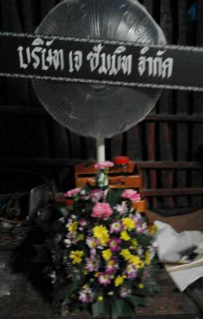ชื่อผู้ส่งพวงหรีด หรือ ชื่อหน้าป้ายพวงหรีด: จ่าเอก โสรส สังกะ (เตี้ย) ผู้บริหาร บริษัท ทีเค.ซิคิวริตี้การ์ด จำกัด
