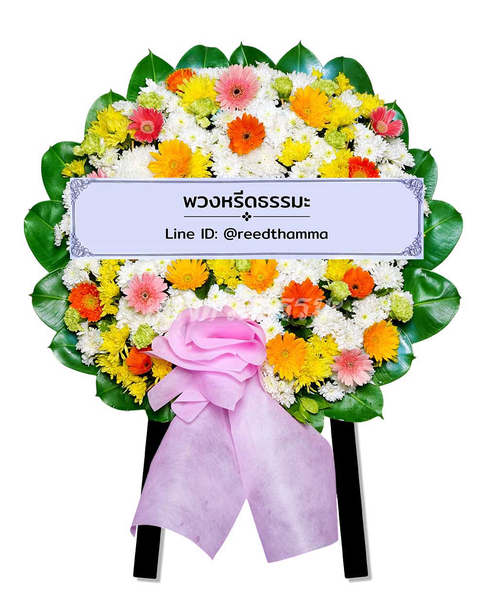 • พวงหรีดดอกไม้สดขนาดใหญ่ โทนสีสดใส ใช้ดอกไม้สีม่วงชมพูขาว รหัส XL02